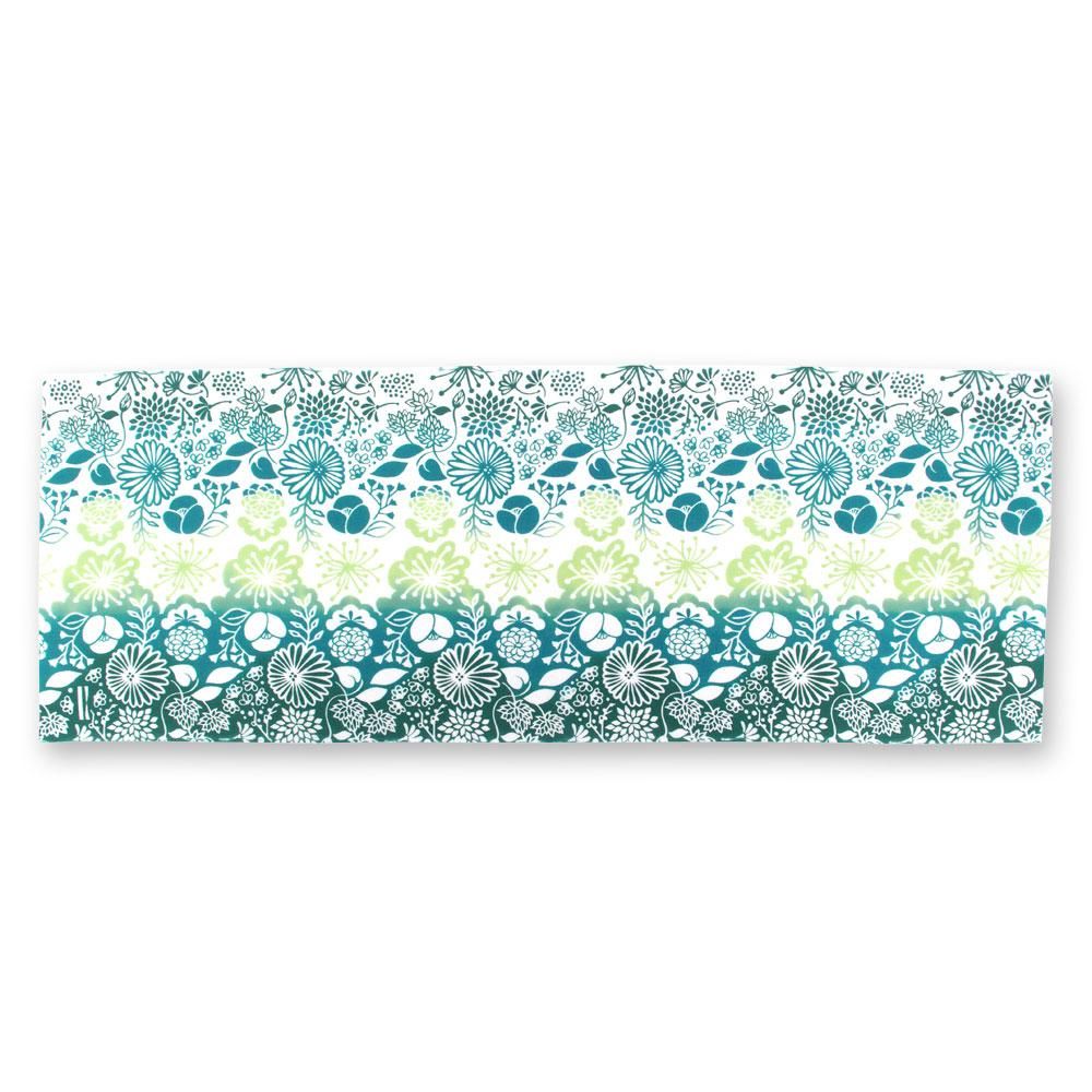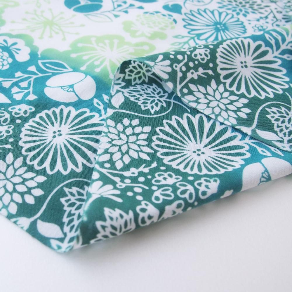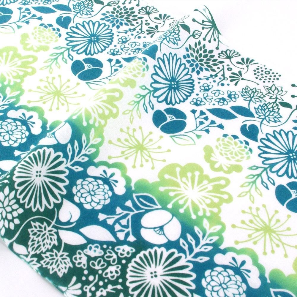 日本の風情ある花々をレース模様でつなぎ注染を活かしたグラデーションで【つながり】を表現しています。