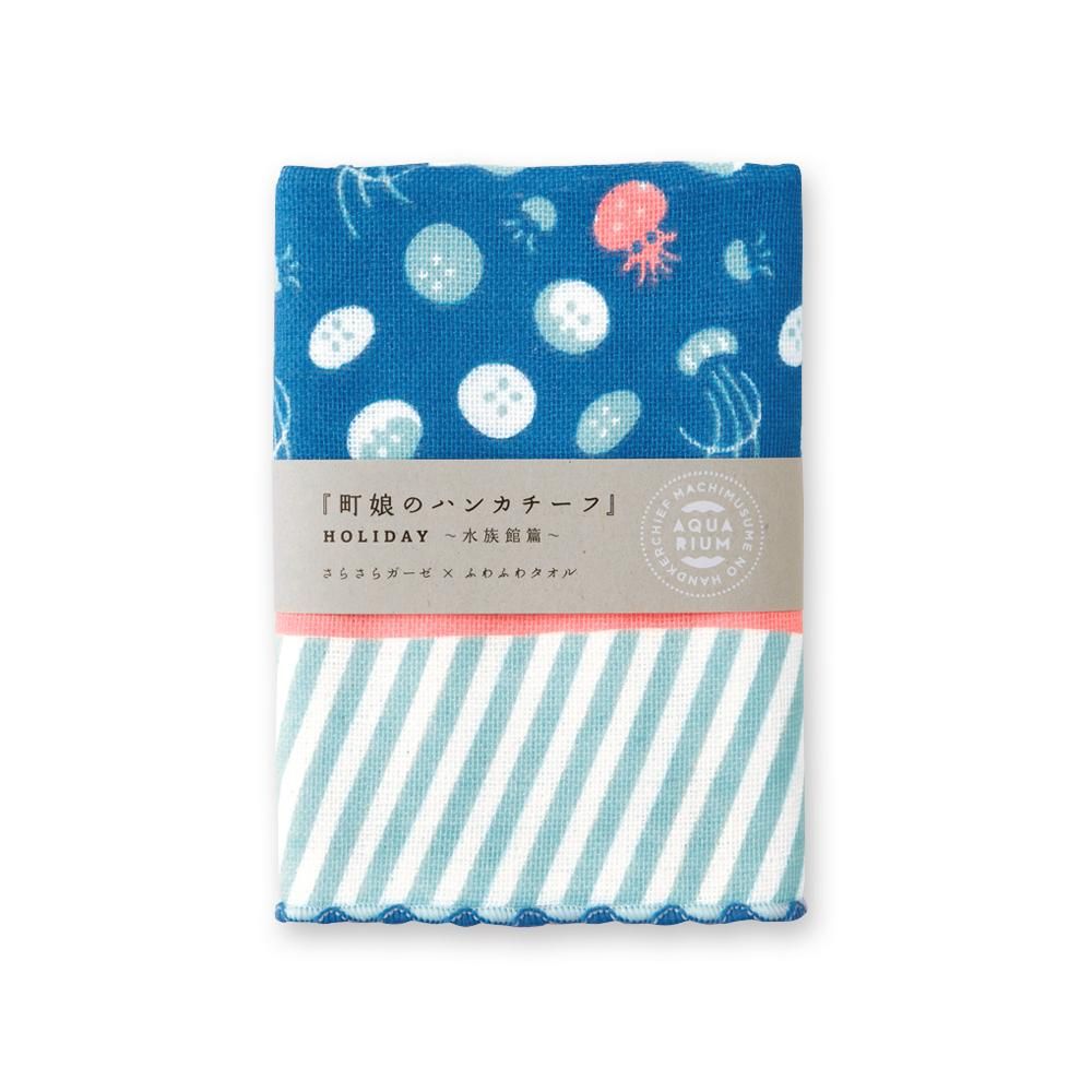 [町娘のハンカチーフ水族館篇]今日は雨が降っているから水族館にいきましょう。水の中をすいすいと泳ぐ姿はまるで空を飛んでいるようね。表面ガーゼ地、裏面タオル地の2枚合わせはんかち。