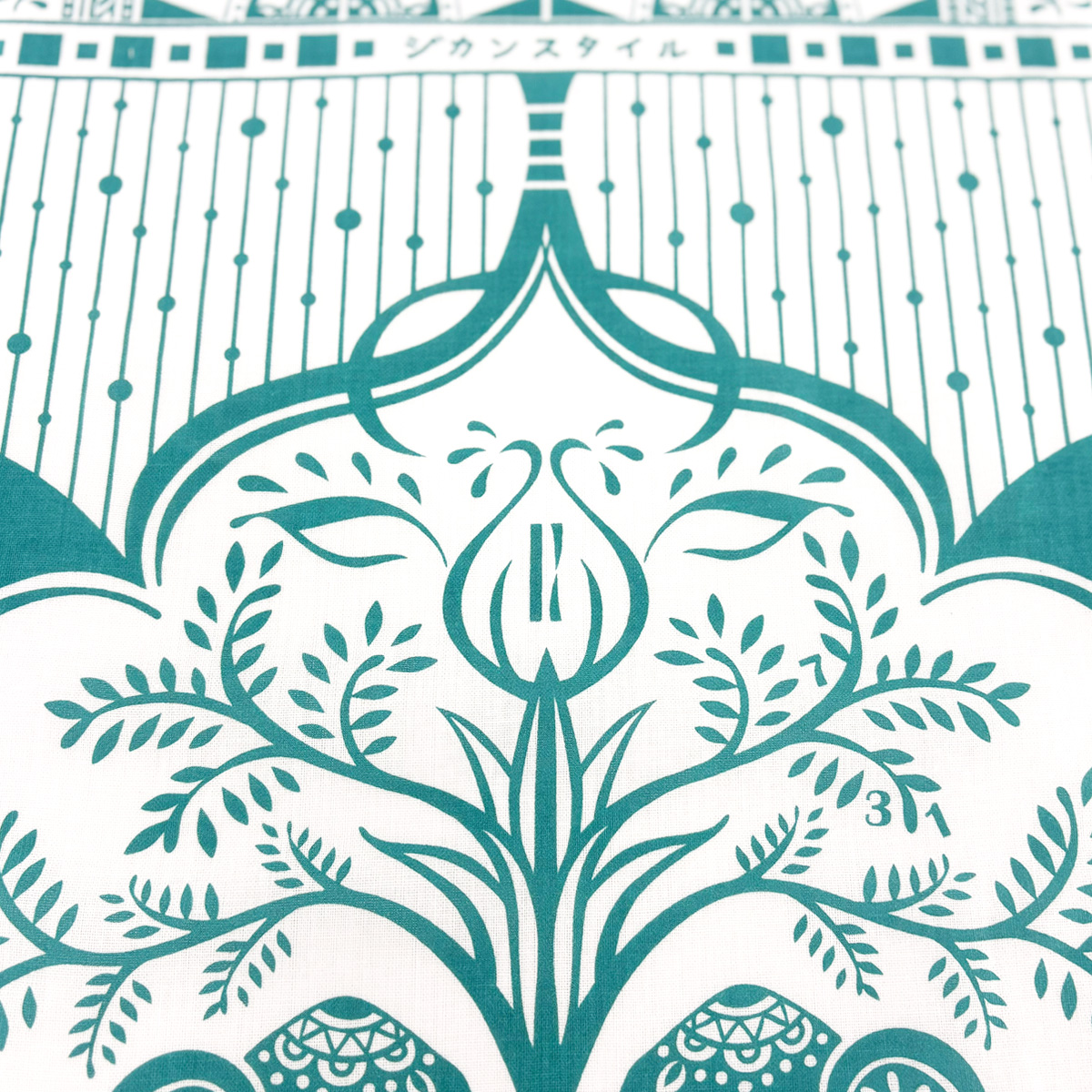 人気の『時感』アラベスクタイルシリーズ「万象の幸福」を、きれいな浅葱色一色でプリント。 デザインの一部をアレンジして、店舗の開店日や店舗名を入れています。