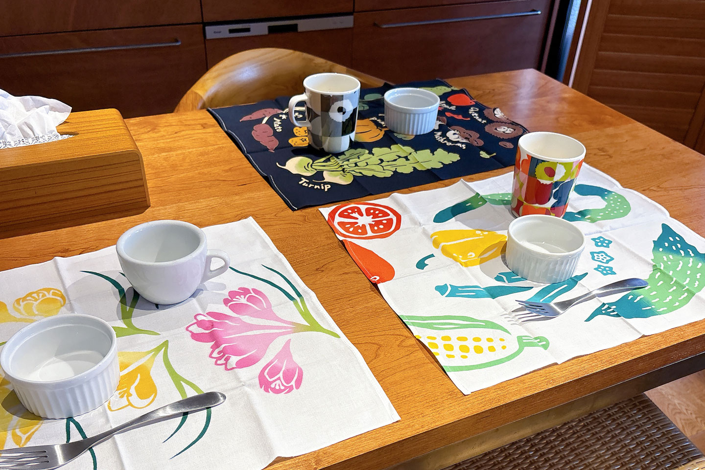 普段使いにもぴったりのサイズ(約43×33cm)で、ハンカチやランチョンマットとしても使いやすく、手軽に注染の良さを体験していただけます。色や柄の組み合わせも豊富で、日常のさりげないおしゃれを楽しむことができます。