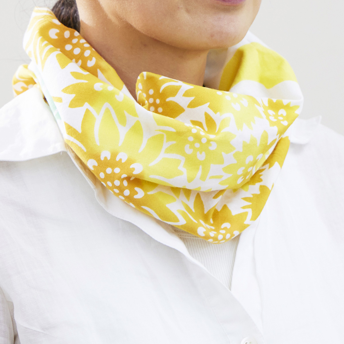 軽やかで遊び心のある柄は、装いに取り入れやすい万能な一枚。ヘアアレンジに使ったり、バッグに結んだりと、さりげないアクセントとして楽しめます。カジュアルな中にも上品さを感じさせてくれるデザインです。